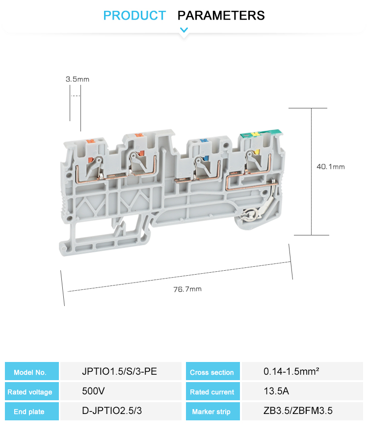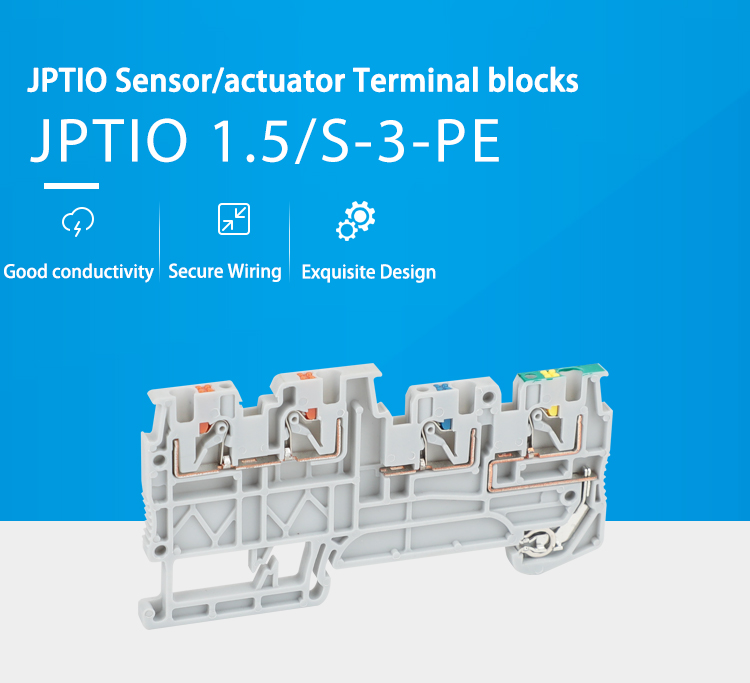 JPTIO1.5/S/3-PE „Klemmenblock“ Der „Klemmenblock“ besteht aus flammhemmendem Nylon PA66, einem Messingleiter und einer Druckfeder aus Edelstahl, um elektrische Sicherheit und mechanische Festigkeit unter rauen Arbeitsbedingungen zu gewährleisten.