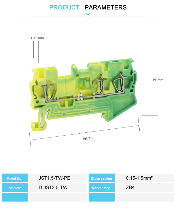 Der ST1.5-TW-PE-Feder-Schrauben, der kostenlose Erdungsanterminalblock ist, nimmt ein innovatives Feder-Clip-Design an, das eine schnelle Werkzeug-kostenlose Installation von 1,5 mm ² Drähten unterstützt und eine stabile seismische Erdungsanlage bietet. Die kompakte kreisförmige Struktur verbessert die mechanische Stabilität und eignet sich für die schützende Erdung von Industriegeräten, Gebäuden und Wohnanlagen. Im Vergleich zu herkömmlichen Schraubanschlüssen verkürzt es die Installationszeit erheblich und ist einfach zu warten, um die elektrische Sicherheit mit zuverlässiger Leistung zu gewährleisten und die modernen Erdungsbedürfnisse verschiedener Szenarien zu erfüllen